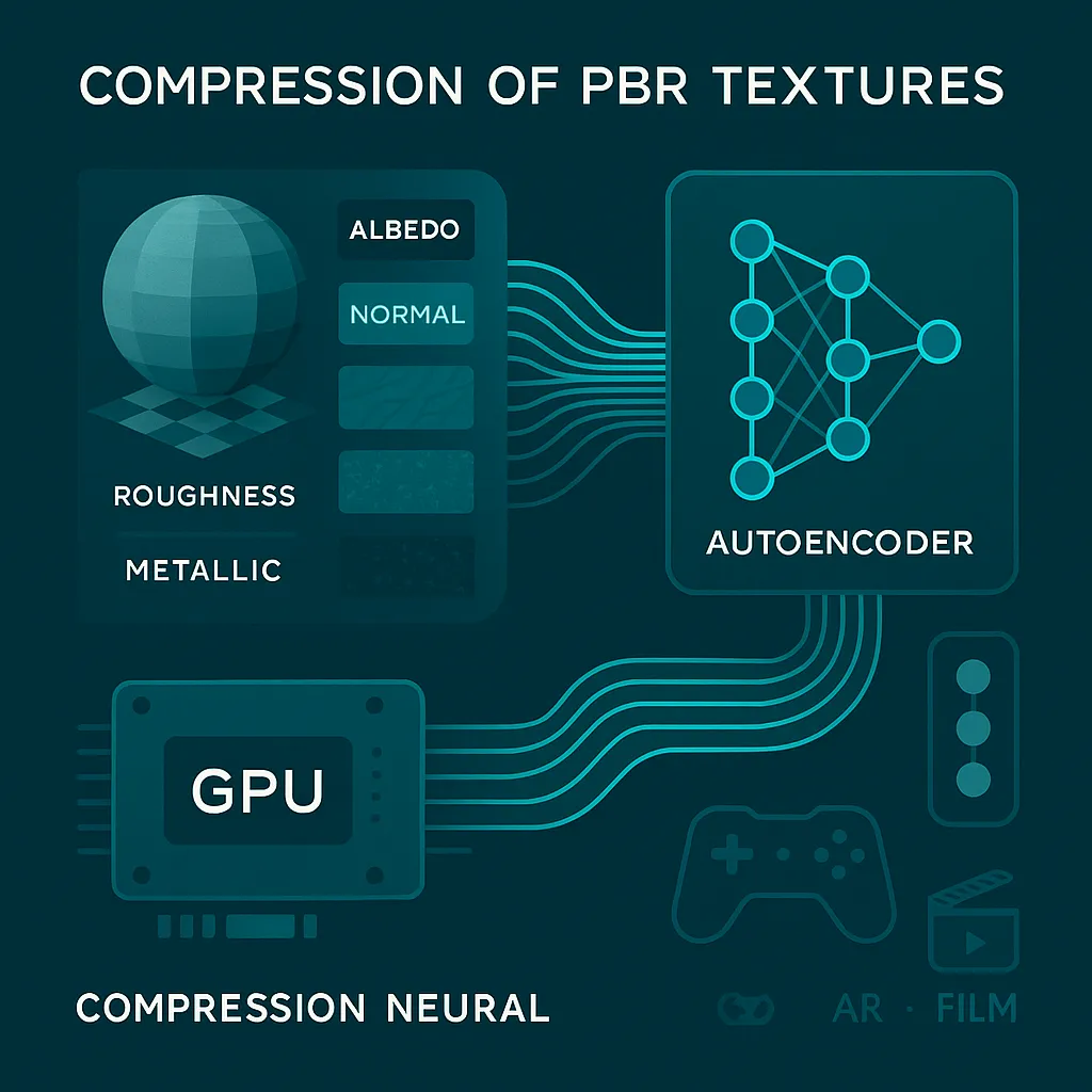 Neural compression of PBR textures (albedo, normal, roughness, metallic) by 5–10x without visible quality loss. Faster scene loading and optimized rendering for games, VR/AR, and 3D graphics.